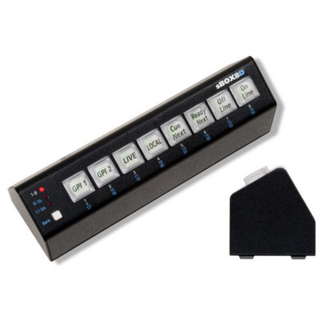 The desktop version of Remote Trigger for gBox and eBox connects the sBOX to gBOX (GPO Trigger Box), or eBOX (Quad Serial/Ethernet/GPI Interface), as a simple, relegendable remote to trigger GPO events. In addition, with eBOX, you can use this unit to trigger the sending of user-programmed serial or Ethernet messages. This remote trigger features 8 LED backlit buttons, and an illuminated bank switch that allows a single sBOX8D remote trigger to control up to 24 GPOs. Multiple sBOX8D remote trigger units (up to 3) can provide dedicated buttons for up to 24 GPOs. This compact unit can be placed behind your computer keyboard.