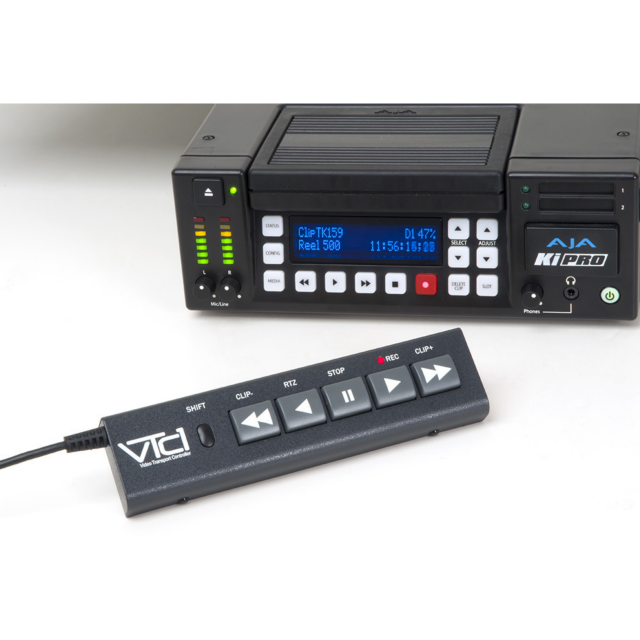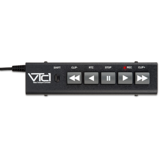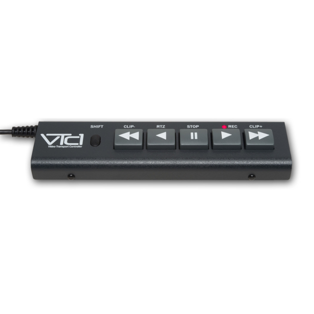 The JLCooper VTC1 Video Transport Controller is a compact remote control for file-based recorders such as the AJA Ki Pro and Blackmagic HyperDeck Studio. Please see more examples in the Features section below. Featuring an integrated 9.8' 9-pin RS-422 cable, it connects to your device for full operation with no additional power supply required. It also works with most 9-pin RS-422 VTRs. It automatically configures itself to provide clip browsing on AJA, FFV, Video Devices, and select other decks that support this feature. For most other devices, a Clip +/- feature offers a shortcut to skip 10 seconds forward or back.