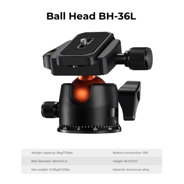- * 【360 Degree Metal Ball Head】36mm metal ball head can be rotated to any angle you want, helping to improve the range of camera activity during panning.The 360-degree panning dial lets you set up precision shots to capture the beauty of landscapes.