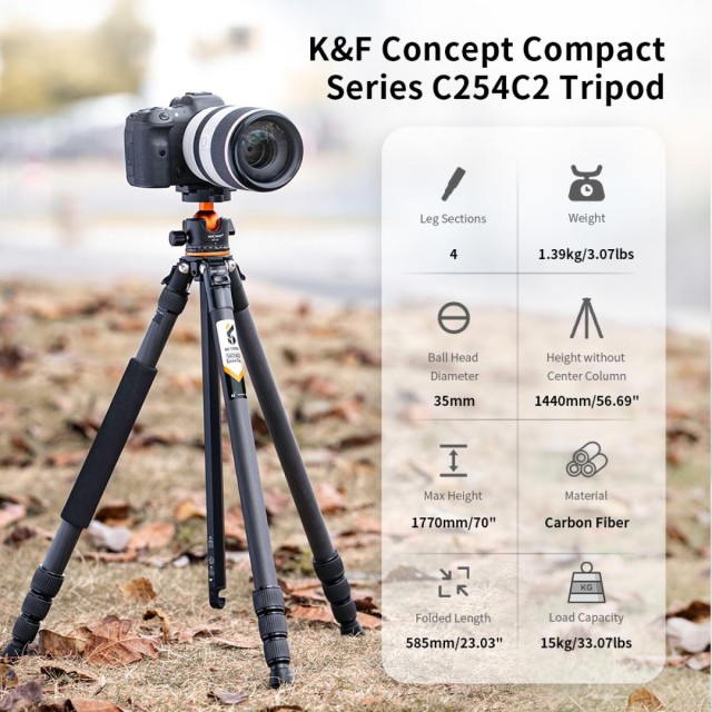 The A254C4+BH-35L tripod is made of carbon fiber and can provide stronger support compared to a tripod made of an aluminum tripod. More weather/corrosion/scratch resistant. The tripod weighs only 3lbs/1.4kg and measures 23"/585mm long when folded.
