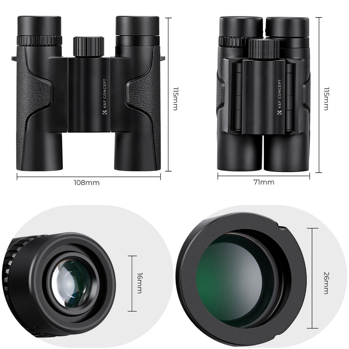 The K&F 10x25 HD Binoculars deliver high-definition viewing in a compact, lightweight design. Featuring BaK4 prisms, FMC multi-layer coated lenses with 99% light transmission, and an IP65 waterproof body, these binoculars provide clear, vibrant images for travel, nature observation, and outdoor activities, while remaining portable and ergonomic.