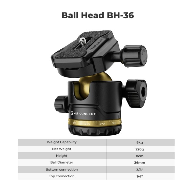 Advanced Ball Head Design: The 36mm large ball head ensures stability, with a new oil-free damping design for smooth and precise camera movements. The 360-degree horizontal scale at the base of the head makes panoramic photography easier, delivering more stunning results than an ultra-wide-angle lens. The ball head can support up to 8Kg.