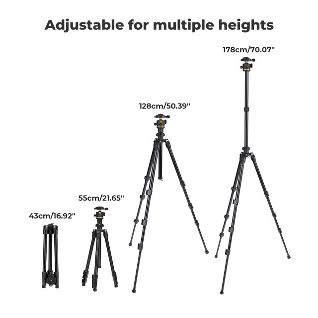Stable and Adjustable: The four-section leg design ensures reliable stability, with a maximum height of 178cm, meeting various shooting environments and photography needs. The tripod folds down to just 430mm, easily fitting into a backpack or camera bag.