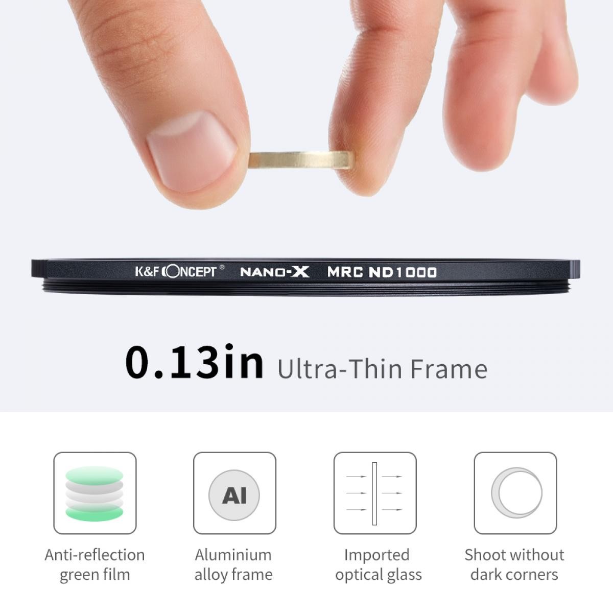 The K&F 37MM XN26 Nano-X Fixed ND1000 Filter delivers 10-stop light reduction for long exposures, maintaining true colors with 28-layer anti-reflection coating, ultra-slim aluminum frame, and durable waterproof, oil, and scratch-resistant construction.