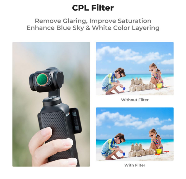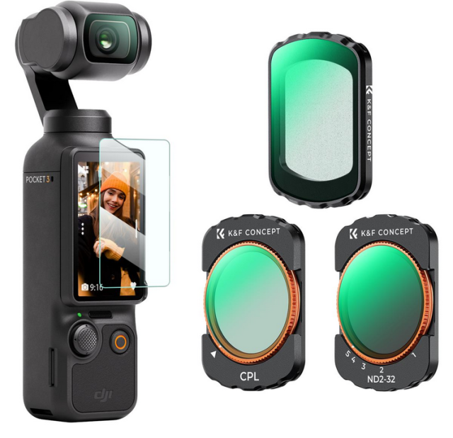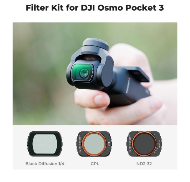 The K&F 3pcs Filter Kit for DJI Osmo Pocket 3 includes a CPL, ND2-32, and Black Diffusion 1/4 filter, all made from top-quality imported AGC optical glass with multi-layer coatings. These filters feature hydrophobic, dust-repellent, grease-resistant, and anti-scratch properties, ensuring easy maintenance and durability. This versatile filter kit covers your daily shooting needs and enhances your photography experience with the Osmo Pocket 3.