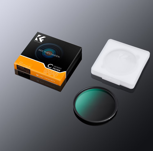 K&F Concept 43mm C Series Black Mist 1/8 Filter: Ultra-thin 3.3mm multilayer green-coated Japanese AGC glass for subtle cinematic diffusion and dreamy highlight glow.