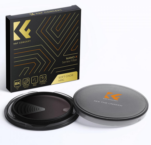 The K&F 49mm Nano-X Soft Graduated ND8 Filter provides 3-stop light reduction to balance exposure between bright skies and darker landscapes. Made with premium AGC Optical Glass and featuring 28-layer coatings, this filter is waterproof, scratch-resistant, and designed to maintain image clarity with no vignetting.