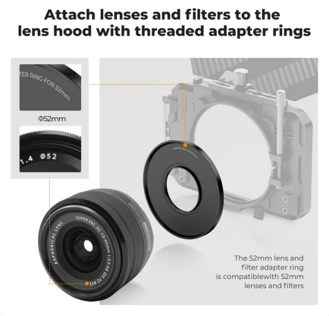 The K&F 52MM Matte Box Adapter Ring is a durable, lightweight solution made from aviation-grade aluminum alloy. With CNC precision processing, it ensures a secure fit with K&F Concept matte boxes, providing stable support and preventing light leakage for enhanced shooting quality.