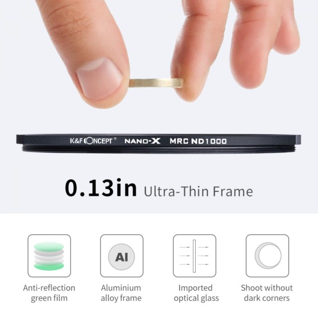 The K&F 52MM XN26 Nano-X Fixed ND1000 Filter delivers 10-stop light reduction for long-exposure photography, maintaining true colors with 28-layer anti-reflection coating, ultra-slim aluminum frame, and durable waterproof, oil, and scratch-resistant construction.