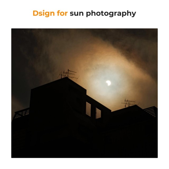 K&F Concept ND1000000 Solar Filter is a 20-stops light reduction neutral density filter, mostly used for solar photography and long exposures. With accurate light reduction, the filter will help guarantee color fidelity and sharp results and capture details of the sun. This ND1000000 solid neutral density filter is made from high quality optical glass with 28-layer of nano coating, which helps reduce filter surface reflection and the ghosting effectively while making the filter anti-scratch, water repellent, oil and dust resistant.