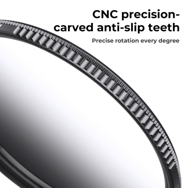 The CNC trapezoidal patterned frame ensures secure handling and smooth rotation for easy installation and removal. Advanced Nano-X coatings make the filter moldproof, waterproof, scratch-resistant, and anti-grease while maintaining image quality. The ultra-thin 5.3mm aviation-grade aluminum frame prevents vignetting on both wide-angle and telephoto lenses, and high-tech gradient coating ensures uniform color and precise dimming. Perfect for landscape and outdoor photography, this filter helps create professional-quality images in challenging lighting conditions.