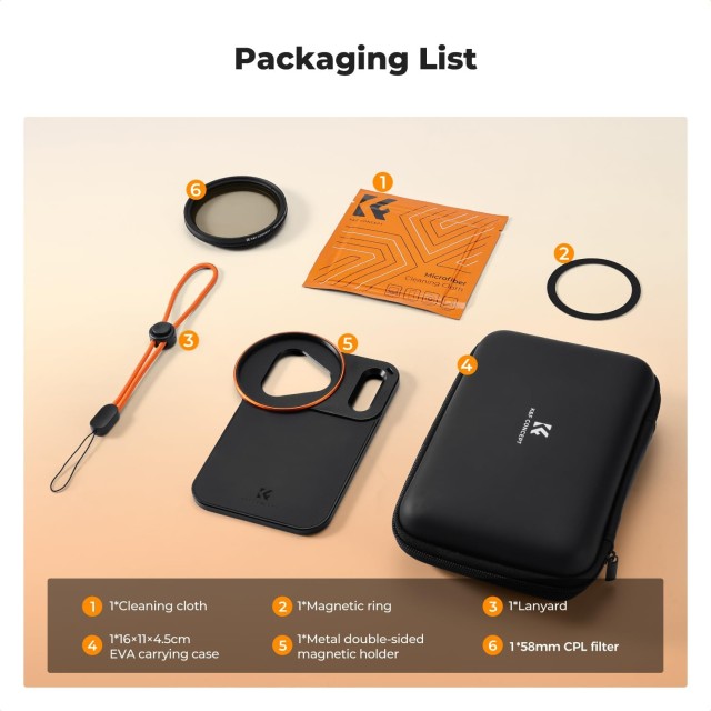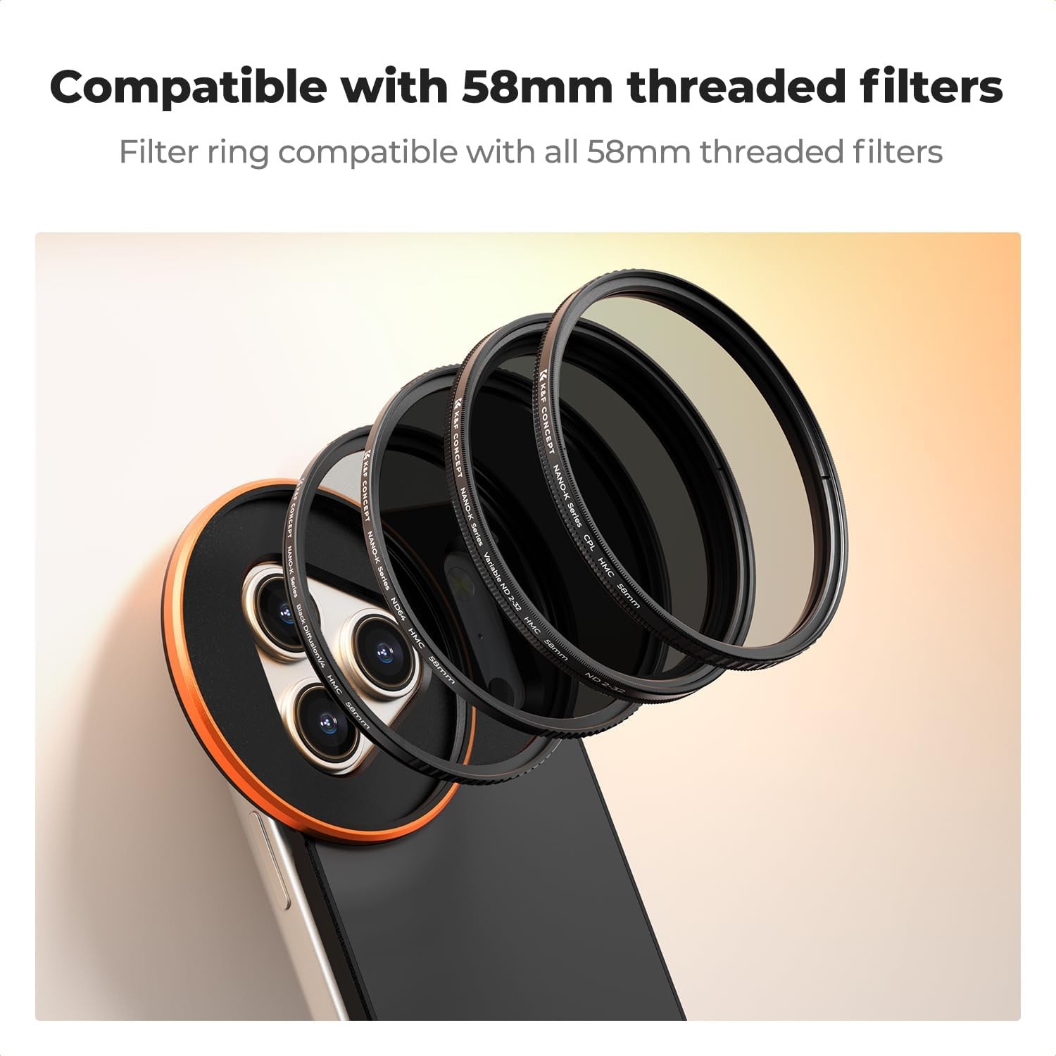 The K&F 58mm Screw-In iPhone Magsafe Double-Sided Magnetic Filter Holder for iPhone 17 Pro Max allows secure attachment of CPL and other 58mm filters, featuring strong double-sided magnets, precision fit, and comprehensive protection for stable and creative mobile photography.