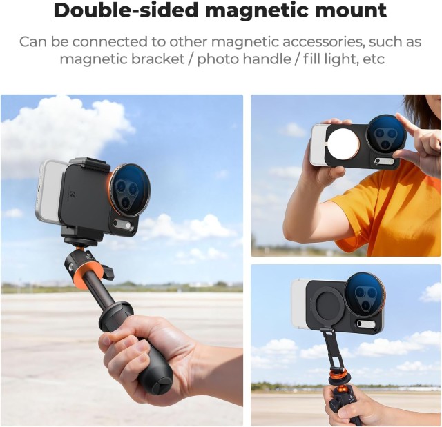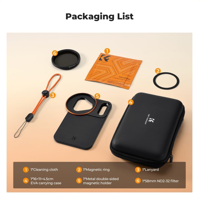 The K&F 58mm Screw-In iPhone Magsafe Double-Sided Magnetic Filter Holder for iPhone 17 Pro Max provides a precision fit, strong double-sided magnets, and supports 58mm filters including the included VND filter. It ensures stable, secure, and versatile mobile photography with comprehensive protection and portable storage.