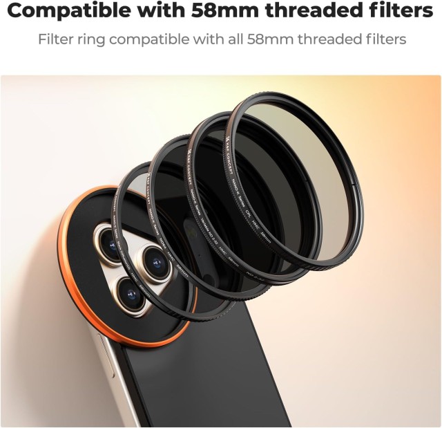 The universal 58mm threaded filter ring is compatible with all major filter types, including ND, CPL, UV, star, and specialty filters. Featuring four precision-cut thread rings, it ensures filters screw in tightly without loosening or obstructing the camera lens. Designed for best performance on a bare iPhone, it also supports Apple official cases or third-party cases when used with the included magnetic ring.