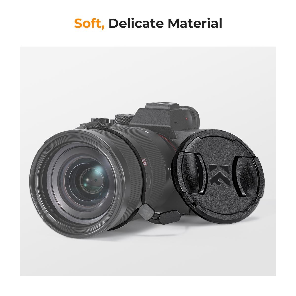 The K&F 58mm Snap-On Center Pinch Lens Cap 7-in-1 Kit provides reliable lens protection with durable center-pinch caps, anti-loss keeper leashes, and vacuum-packed microfiber cleaning cloths, compatible with major camera brands.