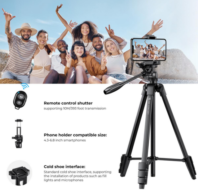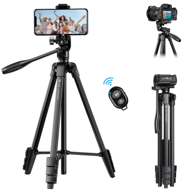The K&F 59.4''/1.5m Aluminum Travel Tripod is a lightweight and versatile tripod designed for both smartphones and cameras. Weighing only 0.61kg, it features adjustable height (17-60 inches), 360° panoramic shooting, and a compact foldable design (42cm) with a Bluetooth remote, making it perfect for travel and outdoor photography.