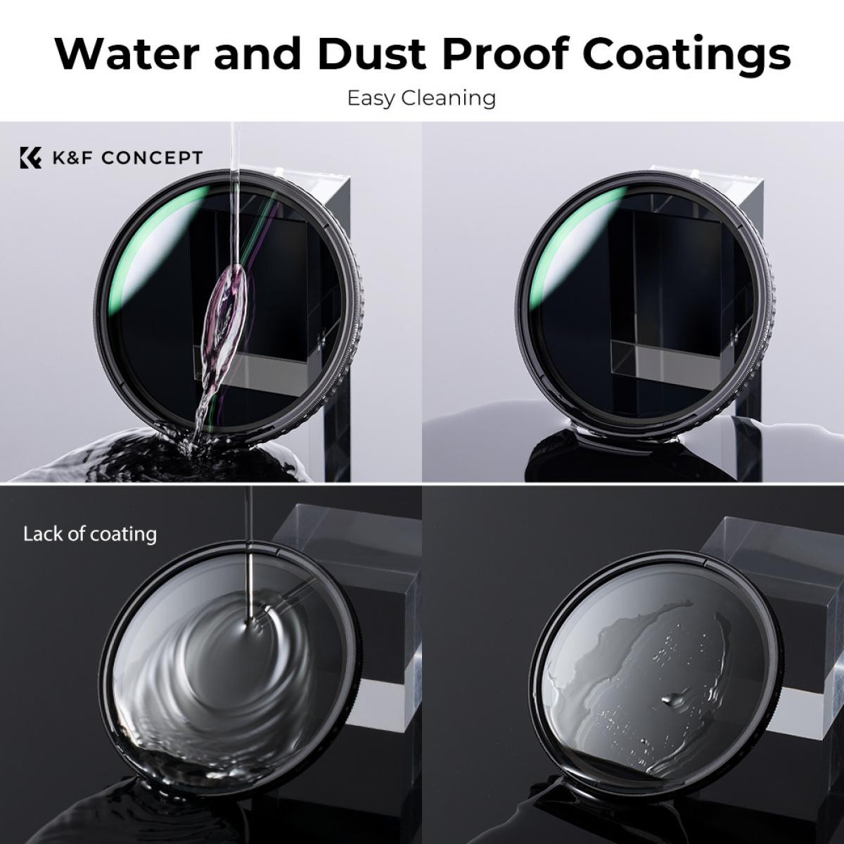 The K&F Concept 62MM Nano-X Variable ND Filter (ND32–ND512) delivers smooth, adjustable light reduction with no–X-cross interference, premium optical glass, and durable 28-layer nano coatings—all housed in a slim, anti-vignetting aluminum frame for flawless long exposures and cinematic motion effects.
