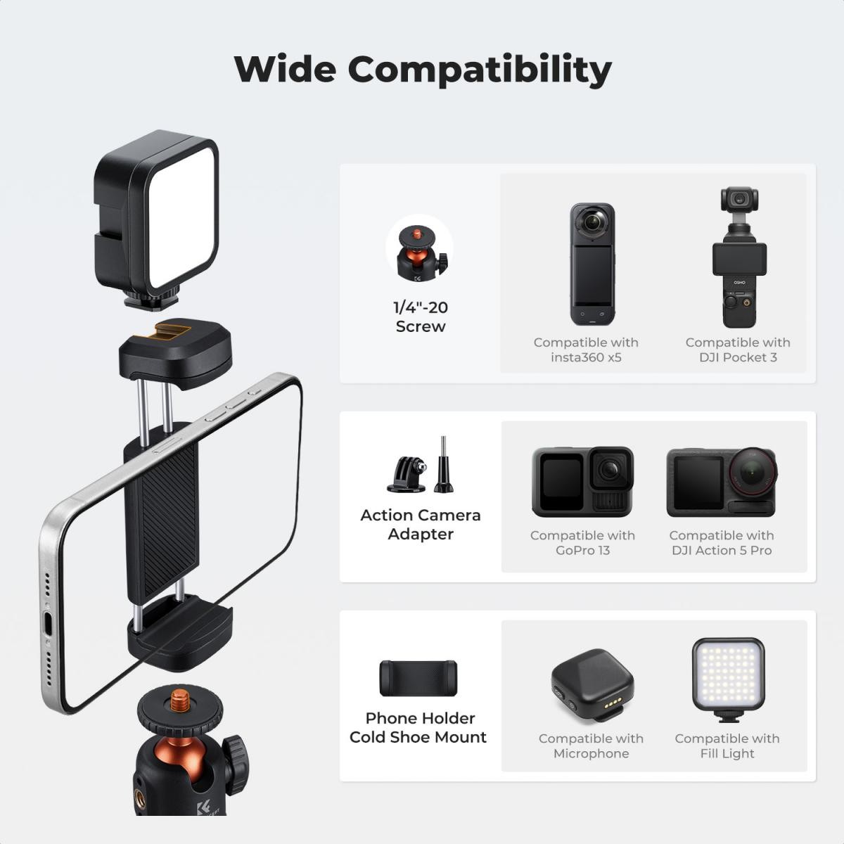 Equipped with a standard 1/4" screw thread on the head of the holder, compatible with compact cameras from brands such as Canon and Sony. Adapters for action cameras and a phone holder are included, making it ideal for use with DJI Pocket 3, GoPro, DJI Osmo Action, Insta360, smartphones, and other devices.