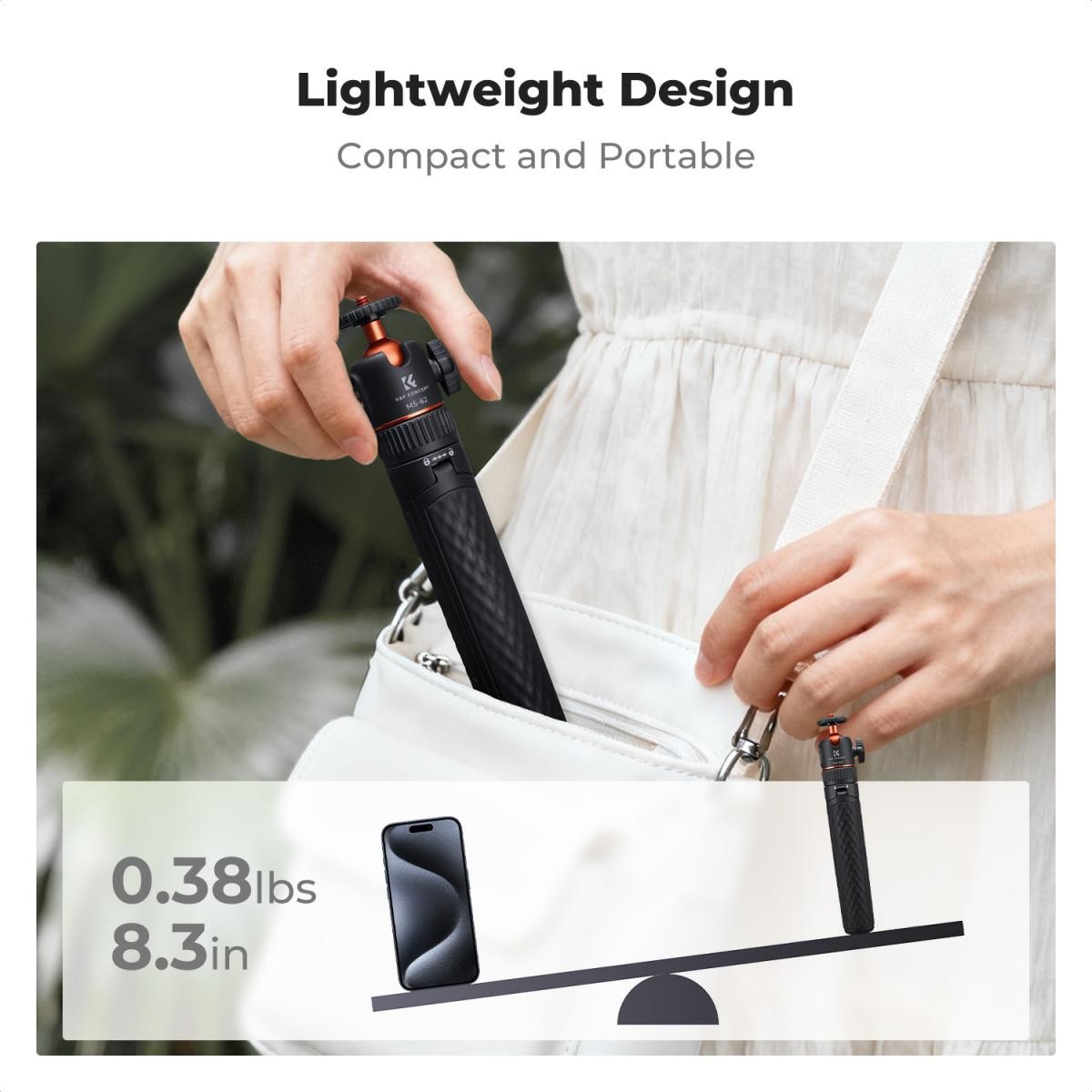 The tabletop tripod weighs only175 g and measures just 21 cm when folded. It is compact enough to easily fit in a bag, backpack, or even a pocket for use on the go.