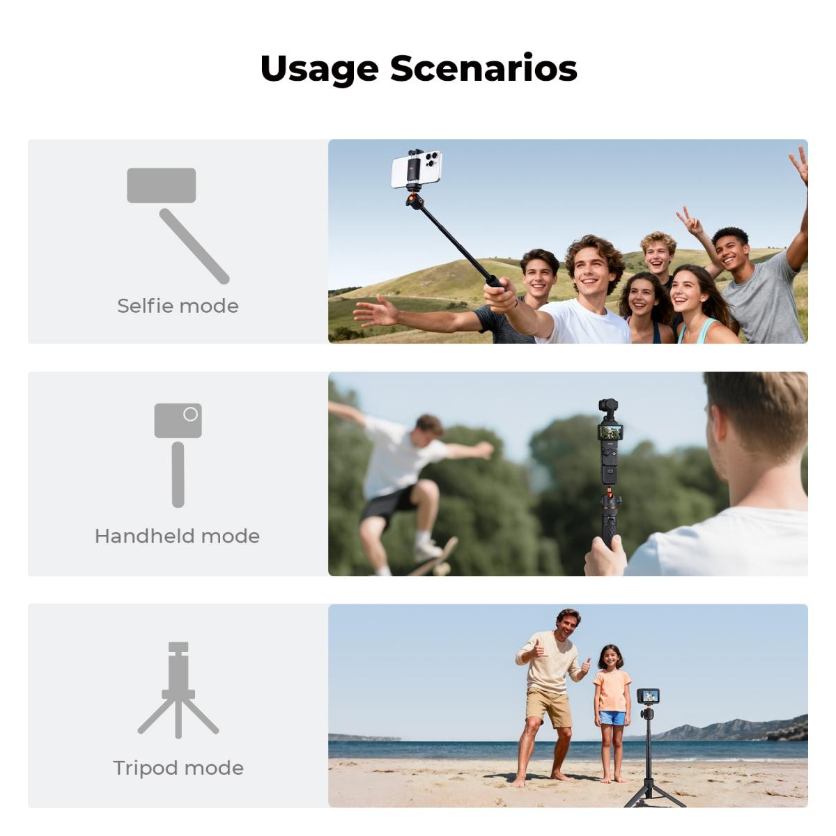 This 25.6" mini selfie stick and mini tripod in one features a 360° ball head and cold shoe mount. It is compatible with DJI Osmo Pocket 3, Action 5 Pro, GoPro Hero 13, and smartphones.