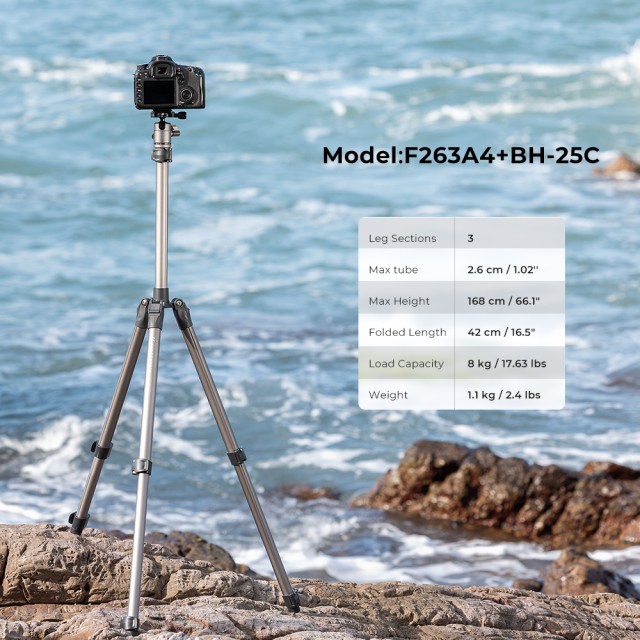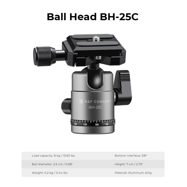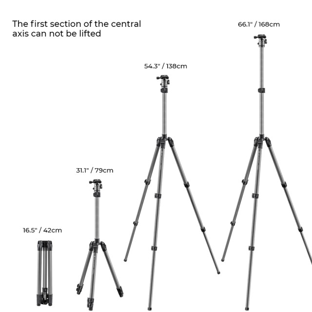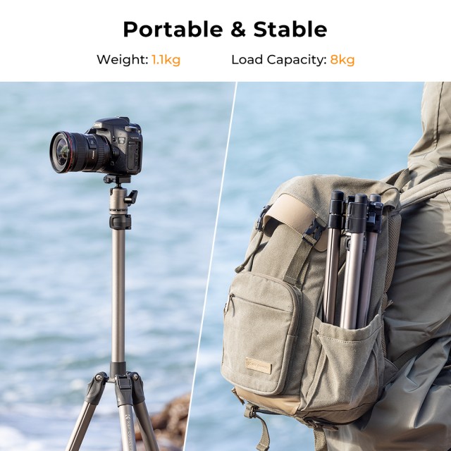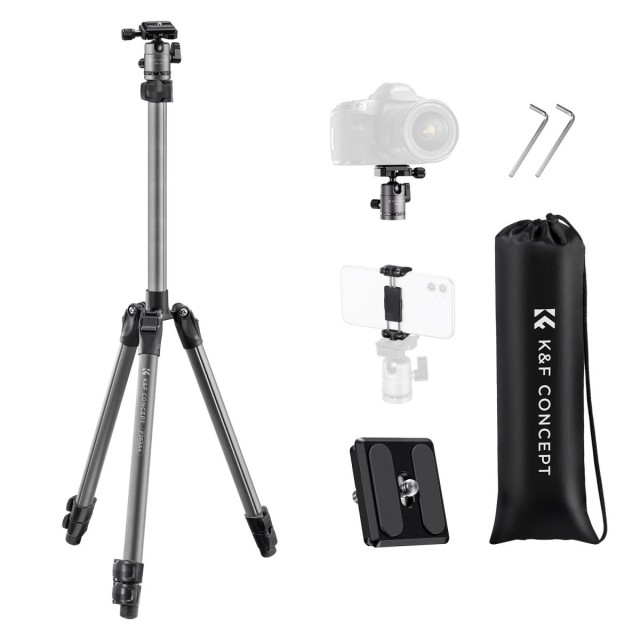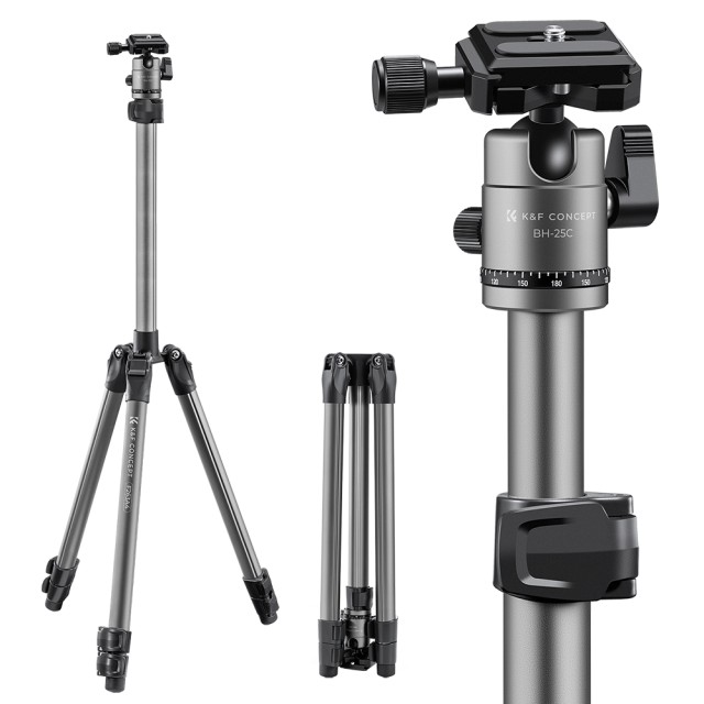 Experience unparalleled flexibility with our K&F Concept tripod featuring a 3-section leg that swiftly adjusts the working height from 79cm/31.1'' to 168cm/66.1'', catering to 90% of photographic height requirements. Its compact folded length of 42cm/16.5'' ensures hassle-free travel. The tripod boasts a 360°Panoramic CNC Metal Ball Head, providing a secure 8kg/17.6lbs bearing capacity for smooth panoramic shooting. The quick flip leg fast locking system allows effortless one-handed operation, saving time and allowing you to focus on the art of photography. Weighing a mere 1.1KG/2.42 lbs, this tripod is a game-changer for outdoor travel photography. Enjoy enhanced compatibility with a standard 1/4 inch thread, making it suitable for most Arca-Swiss quick release plates, cameras, DSLRs, projectors, telescopes, and even cellphones for selfies, live broadcasts, and time-lapse shooting with a cellphone clip. Elevate your photography with the ultimate travel companion.
