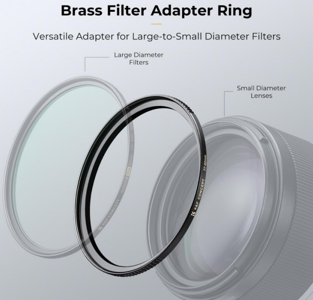 The K&F 72-82mm Step Up Brass Filter Adapter Ring enables the use of 82mm accessories with 72mm camera lenses, offering a seamless way to adapt filters, hoods, flashes, and converters. This adapter ring is crafted from high-quality brass with a classic CNC-molded design, ensuring durability and smooth installation. Its matte black finish is both stylish and practical, reducing reflections and enhancing the look of your gear. The adapter ring ensures a precise fit to prevent light leakage and maintain image quality. The package also includes three vacuum-packed cleaning cloths for maintaining your equipment.