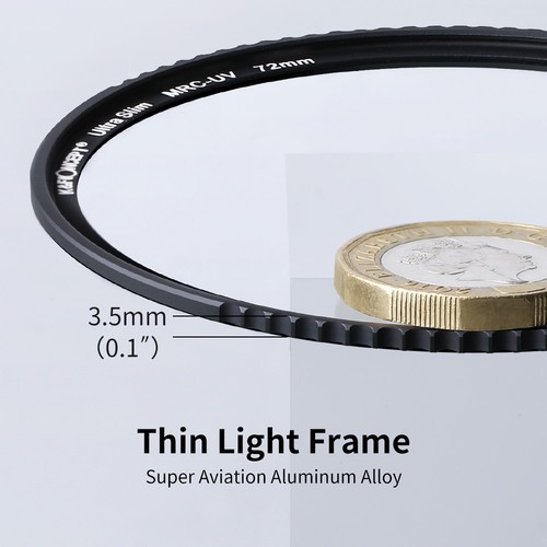 The K&F Concept 77mm XU10 Ultra Slim B270 MCUV Filter with L380 UV cut is designed to protect your lens without compromising image quality. Offering 99.6% light transmittance, it effectively blocks ultraviolet light while maintaining accurate color reproduction. Made from tempered optical glass, this filter provides high hardness and durability to safeguard the front element of your lens against scratches and minor impacts. The advanced 18-layer multi-resistant coating reduces reflections and glare, while the nano resistance coating repels water, oil, and dust for effortless cleaning and long-term performance. Its ultra-slim 77mm aluminum frame minimizes vignetting even on wide-angle lenses, making it an ideal permanent protective filter for outdoor and everyday photography.
