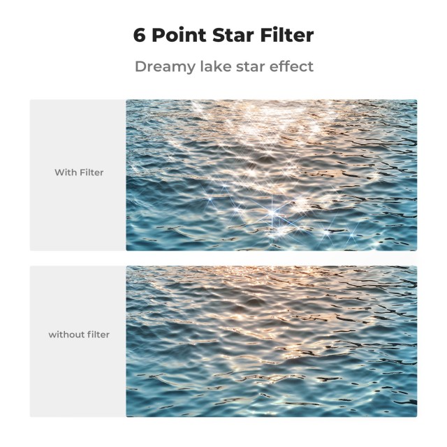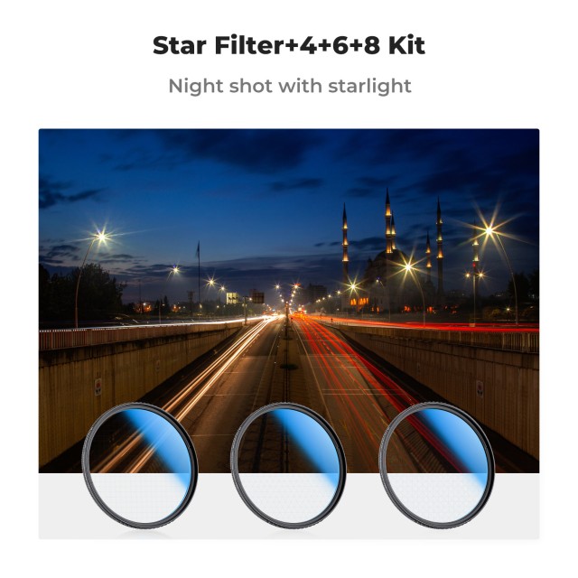 The K&F 82mm Star Filters 3pcs Set includes 4, 6, and 8-point cross screen filters, designed to add unique starburst effects to your photos with high clarity and minimal reflection.