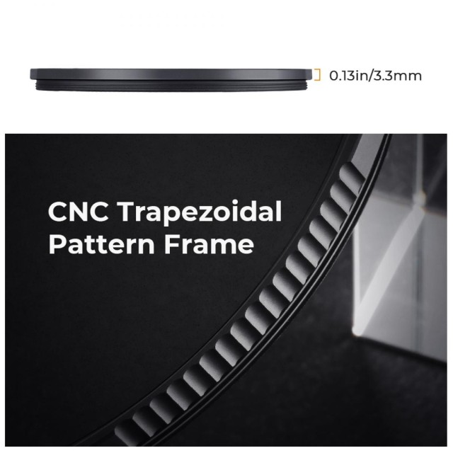 The ultra-slim frame design, measuring only 3.3mm, prevents any vignetting or dark corners, which is particularly important when using wide-angle or telephoto lenses. The CNC-machined non-slip frame design makes the filter easy to attach and remove, adding convenience to its functional benefits.