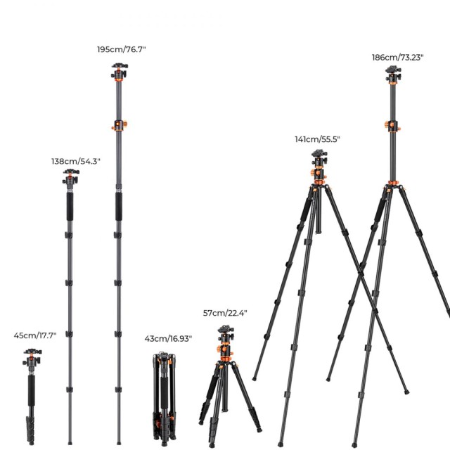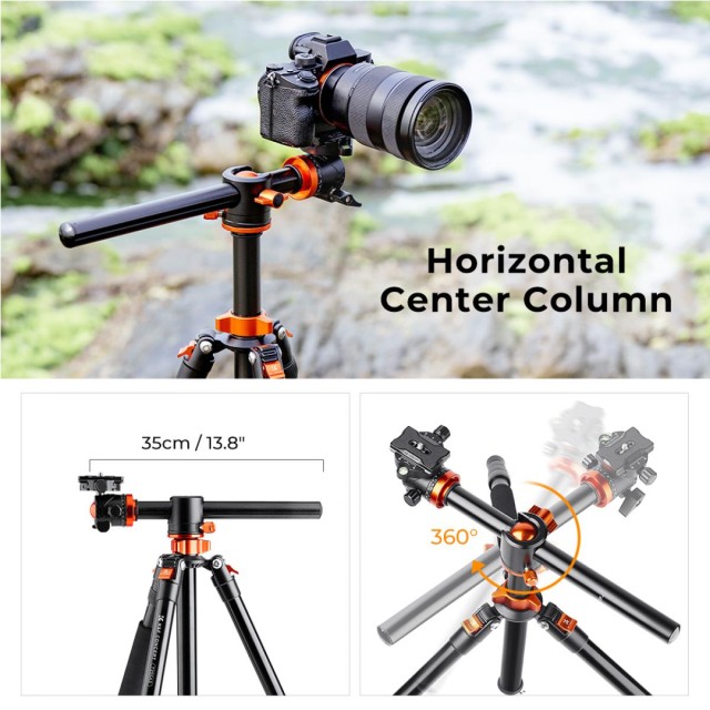 Engineered for photographers seeking versatility and precision, the K&F T255A3+BH-28L aluminum tripod features a transverse center column that rotates 360° horizontally, making it ideal for panorama and macro photography. Its 4-section legs with quick flip locks allow fast height adjustments up to 72 inches, while the detachable monopod adds flexibility for mobile shooting. The durable 28mm ball head ensures smooth 360° rotation for capturing perfect angles, and with a compact folding size of just 19.29 inches, this 1.8kg tripod is easy to carry while supporting up to 10kg of gear.