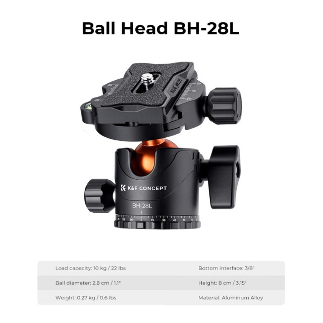 The K&F T255A3+BH-28L is a versatile aluminum camera tripod with a 360° rotatable transverse center column, detachable monopod, and 28mm ball head, ideal for panoramic, macro, and travel photography.