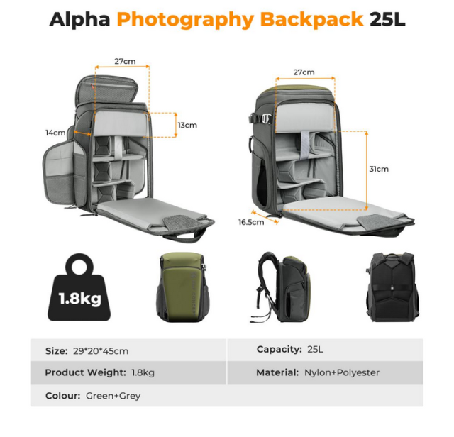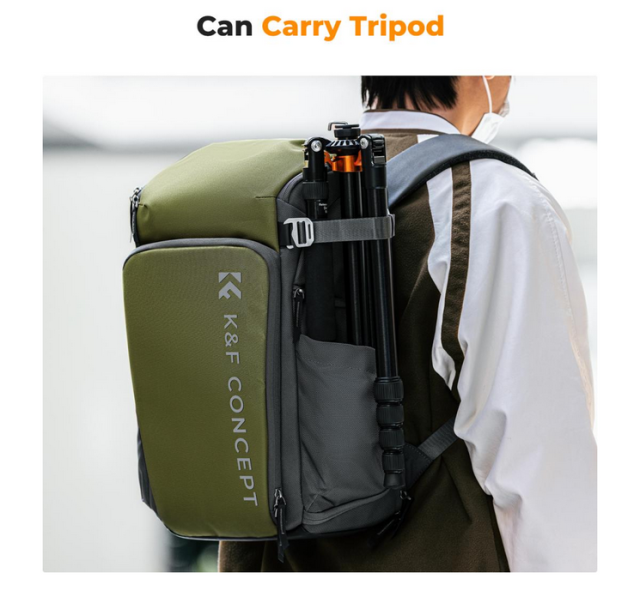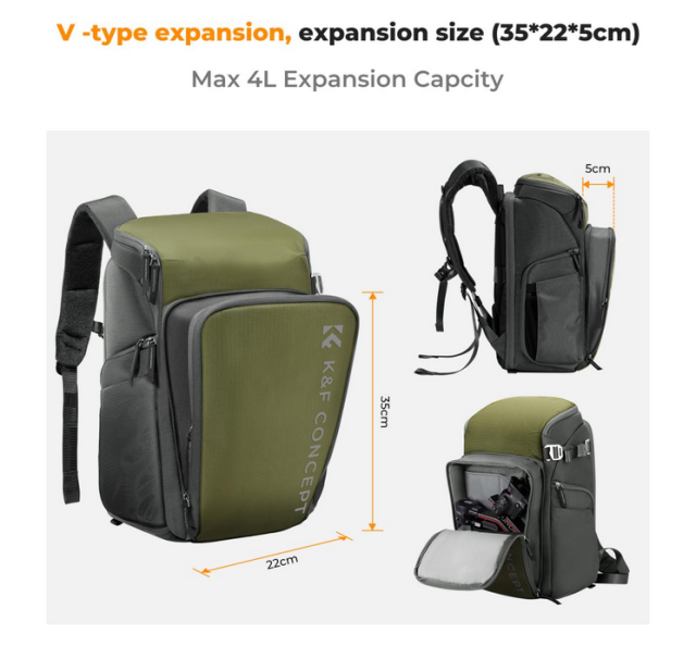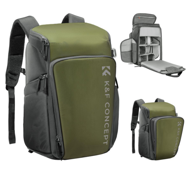The K&F Backpack 25L Nature Wander 01 (Green) is a versatile photography backpack with a Magic Bin design for customizable space, offering top and side access, expandable capacity, and added stability for your equipment. It's perfect for outdoor, street, and portrait photography, with a dedicated compartment for a 16-inch laptop.