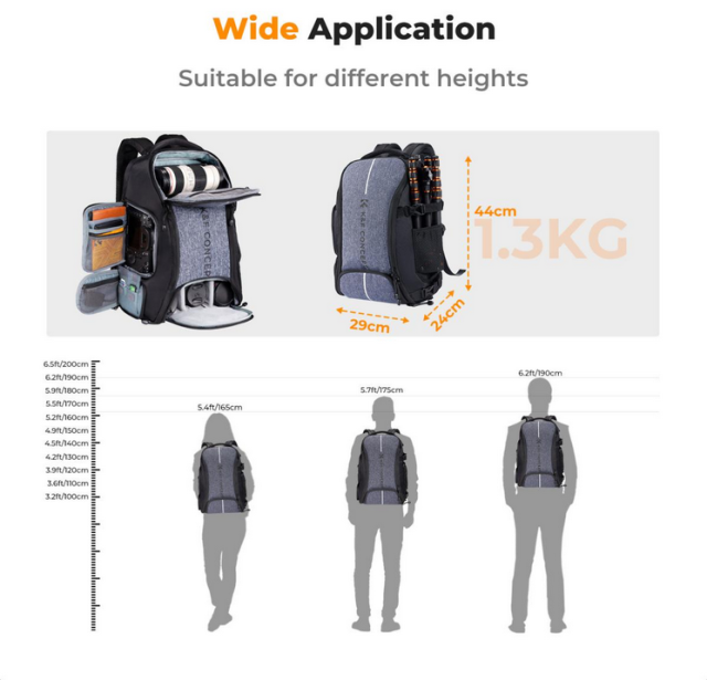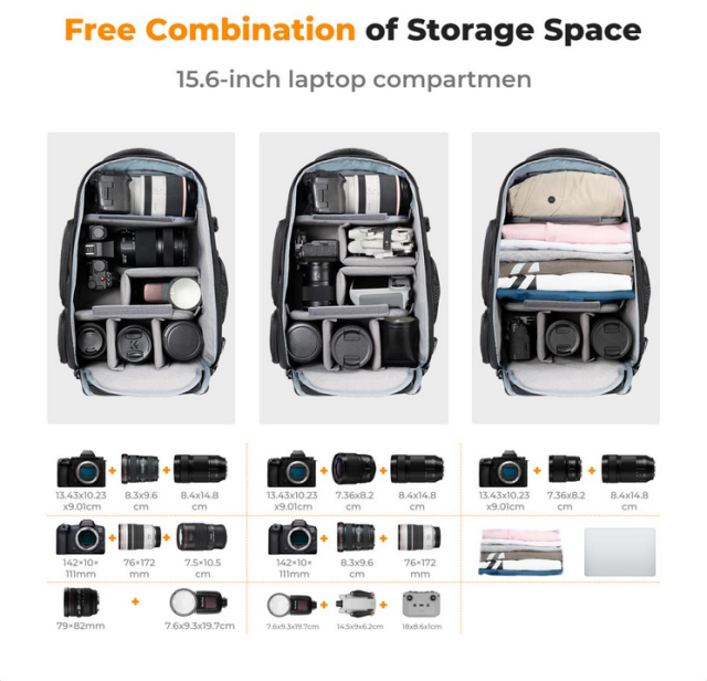 The K&F Beta Backpack 25L is a versatile and spacious camera bag designed for photographers on the go. With dimensions of 17.3 x 11.8 x 9.4 inches and a capacity of 25 liters, this backpack offers three-tiered compartmentalization, providing customizable organization for your gear. The upper compartment is suitable for a 200mm lens or a Mavic Air 2 drone, the medium compartment can hold one camera and two standard lenses or two cameras, and the lower compartment is designed for three standard lenses or one camera and one lens. The inner padding is adjustable to fit your specific needs.
