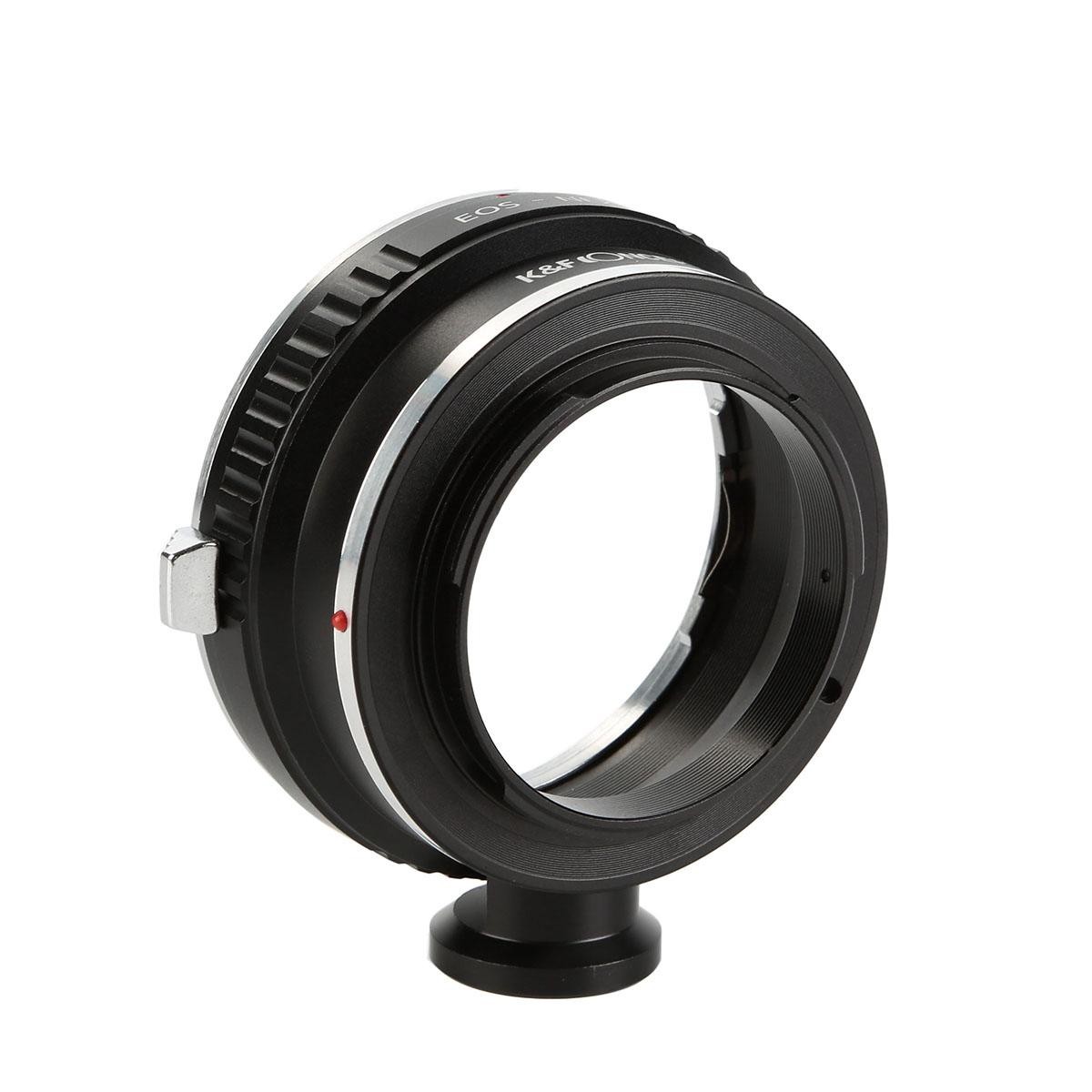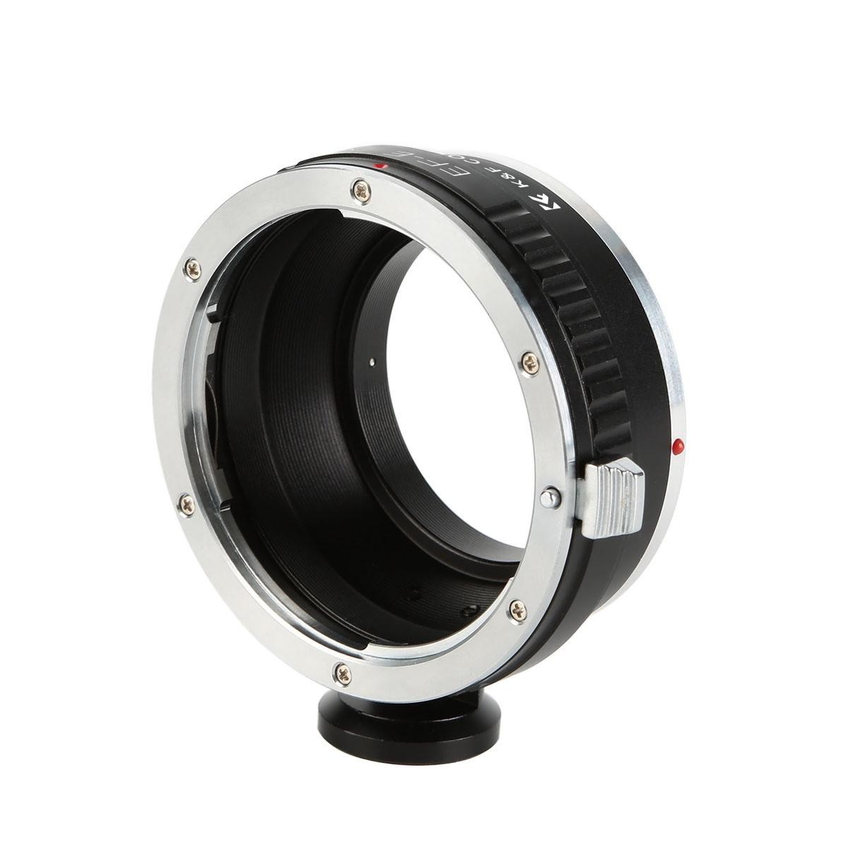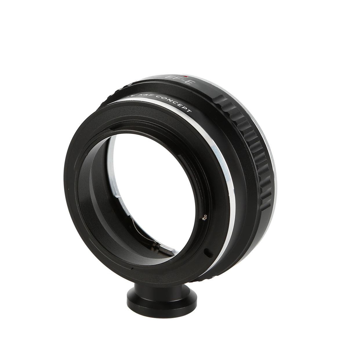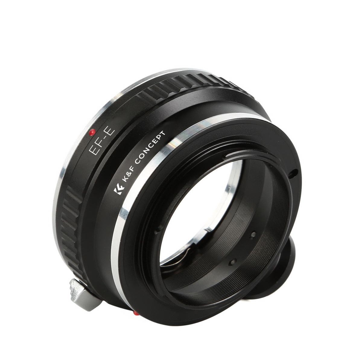 The K&F Concept Canon EOS EF to Sony E-Mount Adapter with Tripod Mount allows Canon EF lenses to be mounted on Sony E-mount cameras with high precision, smooth operation, anodized aluminum construction, and support for infinity focus.