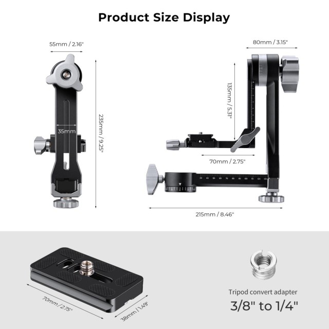 - * High Compatibility: The gimbal tripod head bottom has a 3/8 inch screw hole, it can be widely applied to various professional tripods; and also comes with 1/4 inch screw removable quick-release plate, which is suitable for SLR, DSLR cameras.