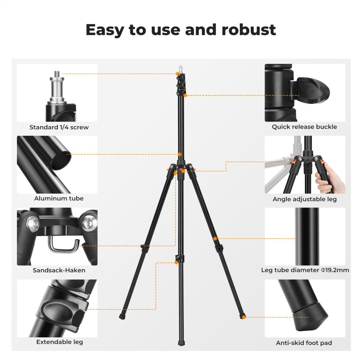 K&F CONCEPT 2pcs 2.0m Aluminum Foldable Light Stands with 1/4" Screws & Bag – for Video & Studio Lights. Made of lightweight aluminum alloy, weighs only 870g with a folded size of 43.2×9cm—fits easily in backpacks or 20" suitcases, perfect for travel and outdoor shoots.