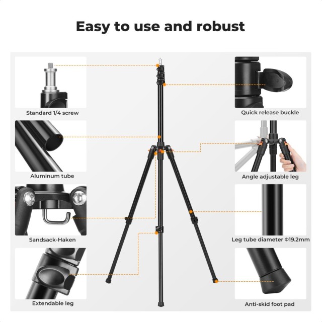 the 2m aluminum folding light stand K&F CONCEPT features a 1/4" screw and a bag. Ideal for ring lights, softboxes, etc.