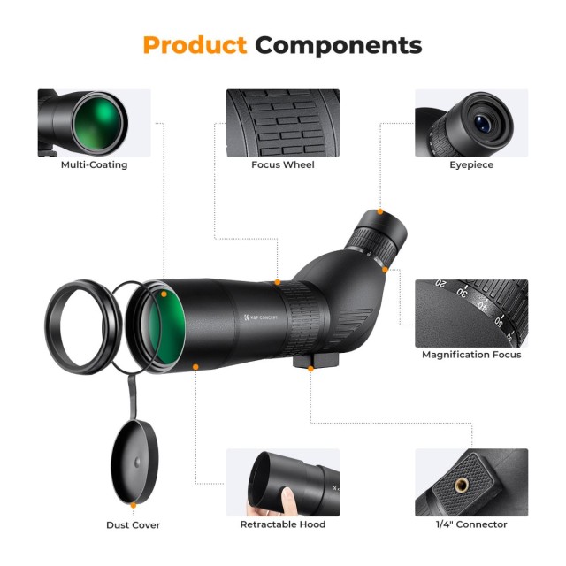 20-60x60 Spotting Scopes for Target Shooting, Waterproof Spotter Scope with Tripod & Phone Adapter, 45°Angled Eyepiece Range Scope for Bird Watching Wildlife Hunting. Powerful zoom magnification runs from 20x to 60x, with 40m-20m wide field of view, allows you to lock onto the target and zoom in for more details. 45 Degree angled eyepiece offers comfortable…
