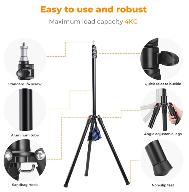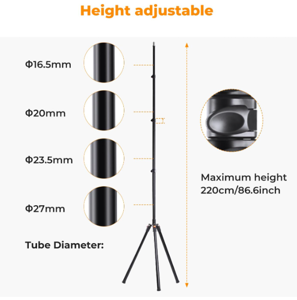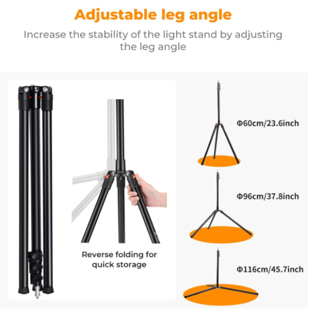 Engineered for photographers and videographers who demand reliability without bulk, the K&F Concept 86.6-inch/2.2m Light Stand combines robust aluminum alloy construction with an innovative reverse-folding tripod base that collapses into a compact 21.7-inch (55cm) package—perfect for studio organization or mobile shoots. Extending up to an impressive 86.6 inches (219.5cm) and adjustable down to a minimum height of 40.3 inches (102.3cm), this stand offers exceptional flexibility for overhead lighting, background support, or low-angle setups, while its lightweight 1.95 lbs (1039g) design ensures effortless portability.