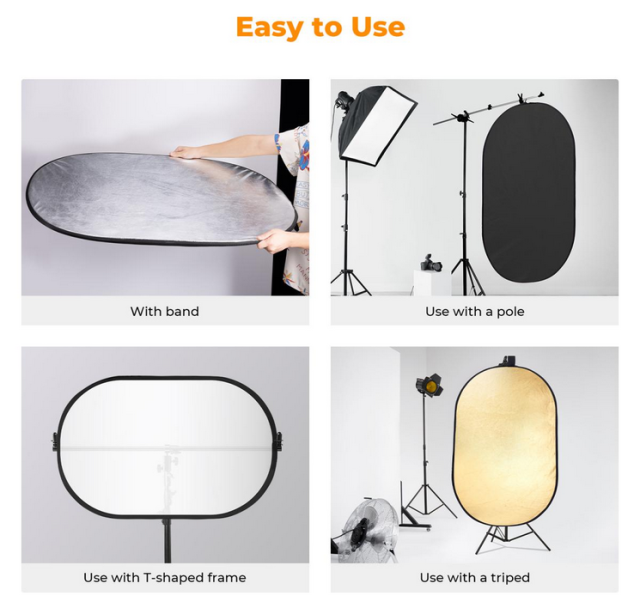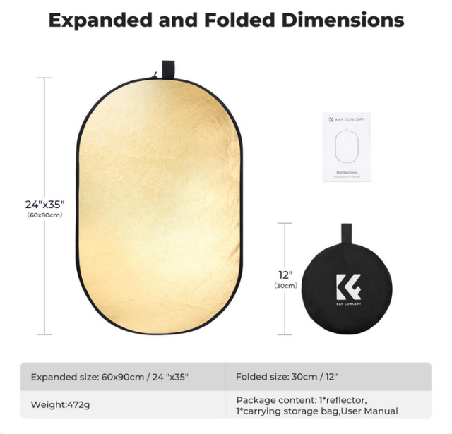 The K&F Concept 24" x 36" (60x90cm) 5-in-1 Oval Foldable Reflector offers versatile lighting effects with five coatings: gold, silver, white, black, and translucent. Lightweight and portable, it folds quickly for storage and travel, ideal for photographers seeking flexible lighting control.