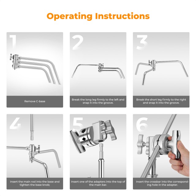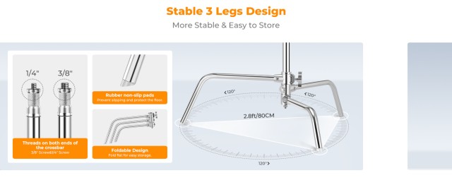 The crossbar ends feature 1/4” and 3/8” threads, offering compatibility with a wide range of devices. The included adapters accommodate rods of varying diameters, enhancing versatility. The foldable C-shaped base with anti-slip pads provides excellent stability and compact storage. Additional sandbags can be used for added steadiness during demanding setups.