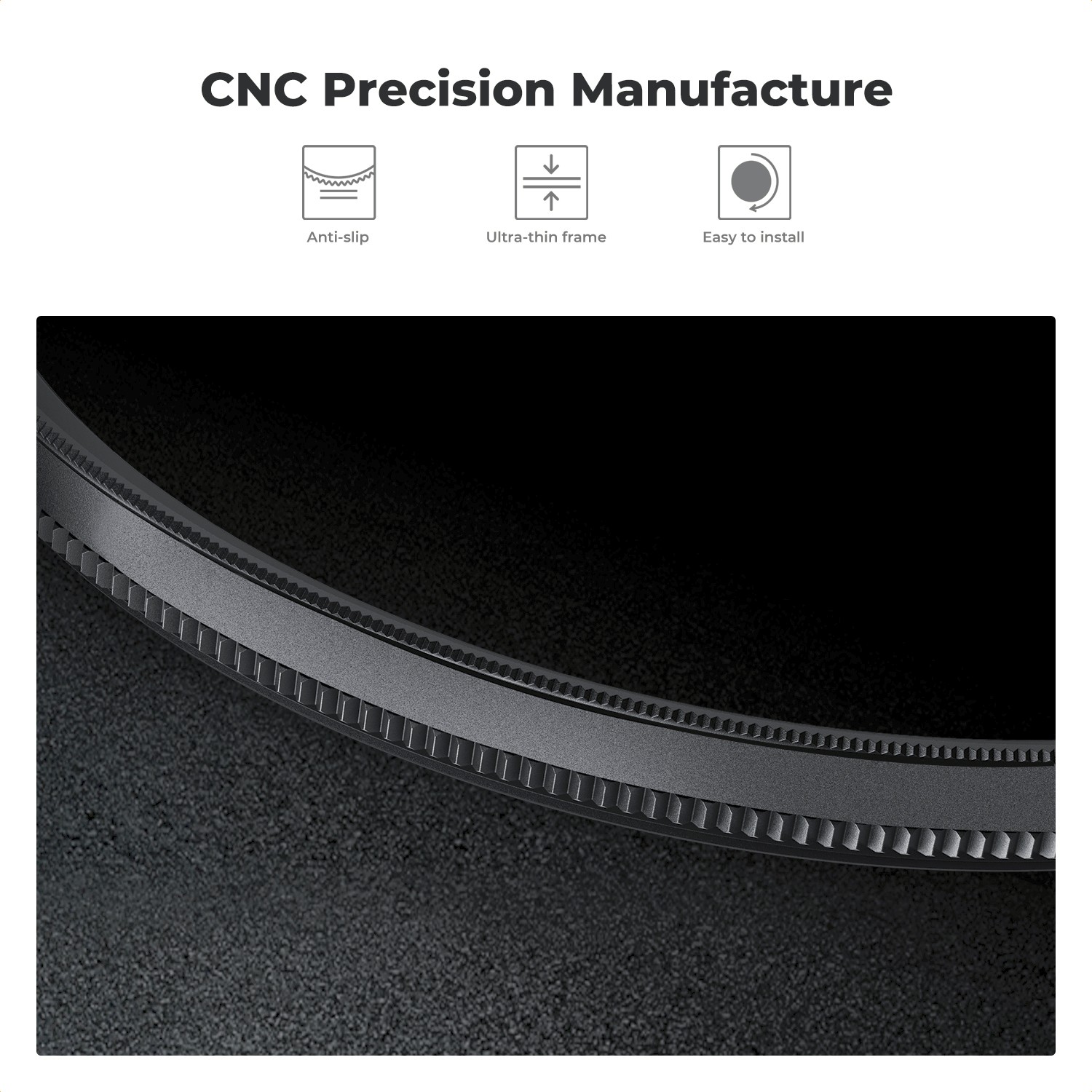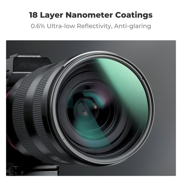 Constructed from premium AGC optical glass, the filter features 18 layers of advanced multi-coating to minimize glare, ghosting, and reflections. A durable nano-coating provides resistance against fogging, water, dust, and scratches for reliable performance in outdoor and demanding environments. The ultra-thin, aircraft-grade aluminum frame ensures compatibility with wide-angle lenses without vignetting, while the CNC-machined trapezoidal pattern improves grip for easy installation and smooth adjustment.