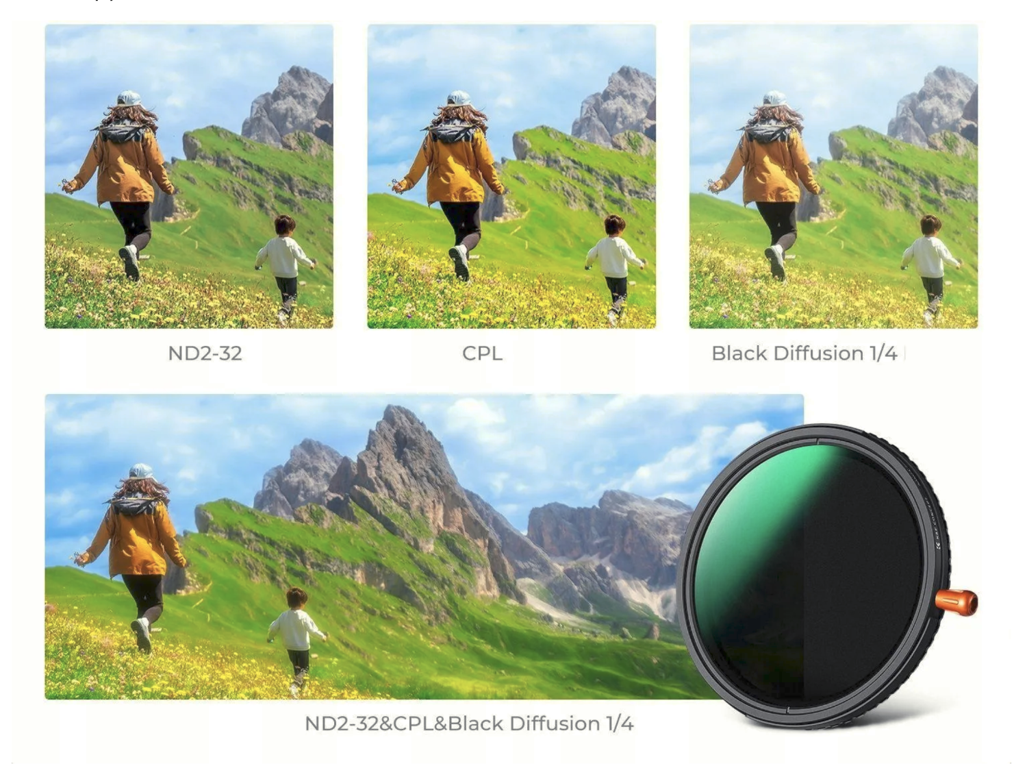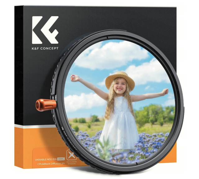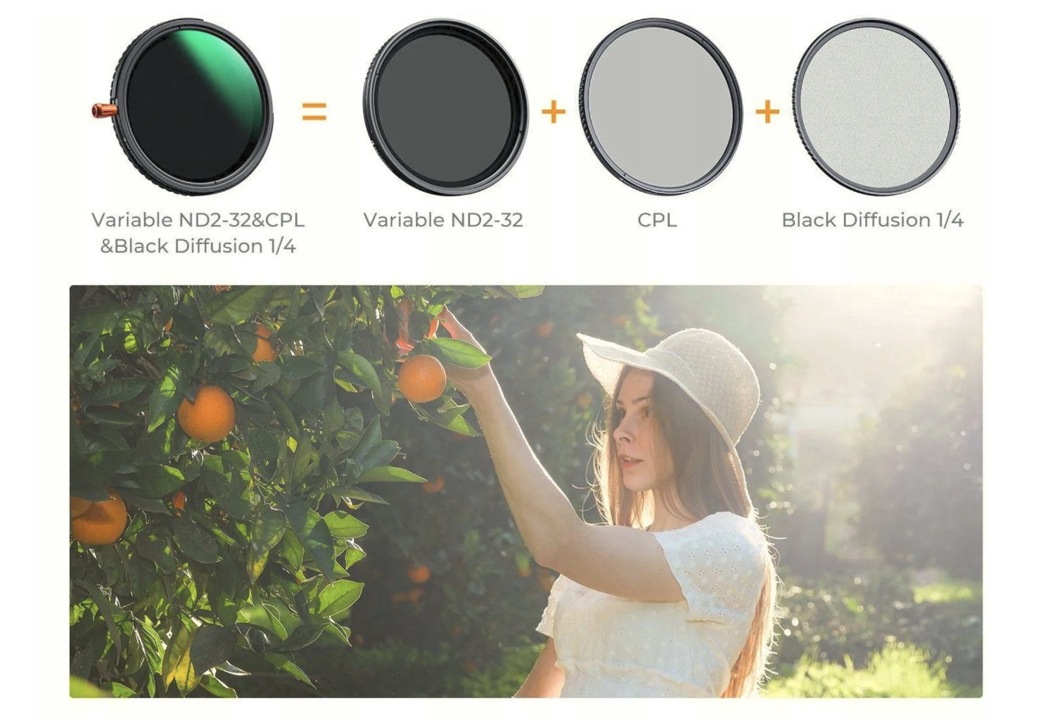 The K&F Concept 37mm NANO C Series 3-in-1 Filter combines a Variable ND2–32, CPL polarizer, and Black Mist 1/4 diffusion filter into one compact, high-performance solution. Designed for both photographers and filmmakers, it offers precise light control, enhanced color and contrast, and a cinematic soft-glow effect—without the unwanted black “X” common in many variable ND filters.
