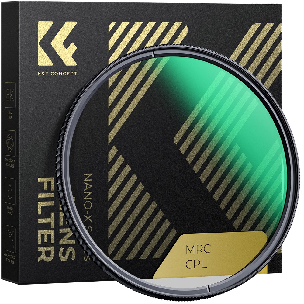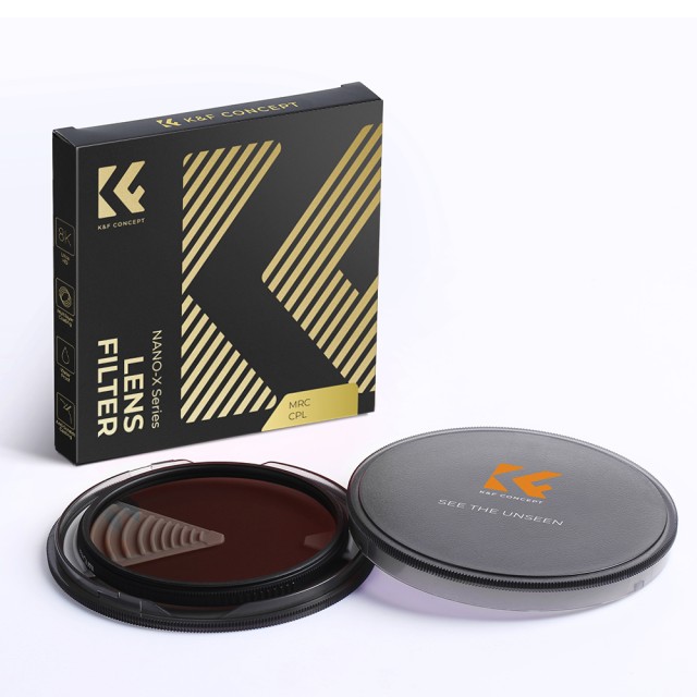 K&F Concept 39mm Nano-X XC15 CPL Filter: HD German B270 glass with 28-layer green coating, waterproof, anti-scratch, ultra-slim design for vivid colors and glare-free shots.