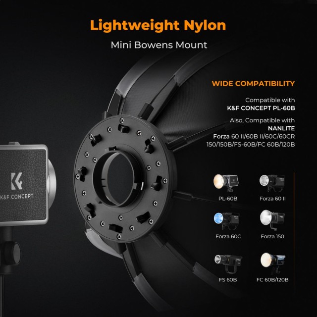 Specifically designed for the PL-60B COB light, it requires no additional adapter for installation. It is also compatible with Nanguang Forza 60 II/60B II/60C/60CR/150/150B, FS-60B and FC 60B/120B lights.