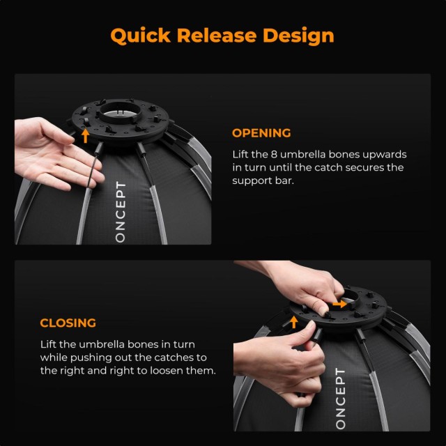 The integrated design of the softbox ribs and handle requires no assembly. Just pull out all 8 ribs and you're done in seconds. To assemble, lift each rib and push the handle to the right for quick release.