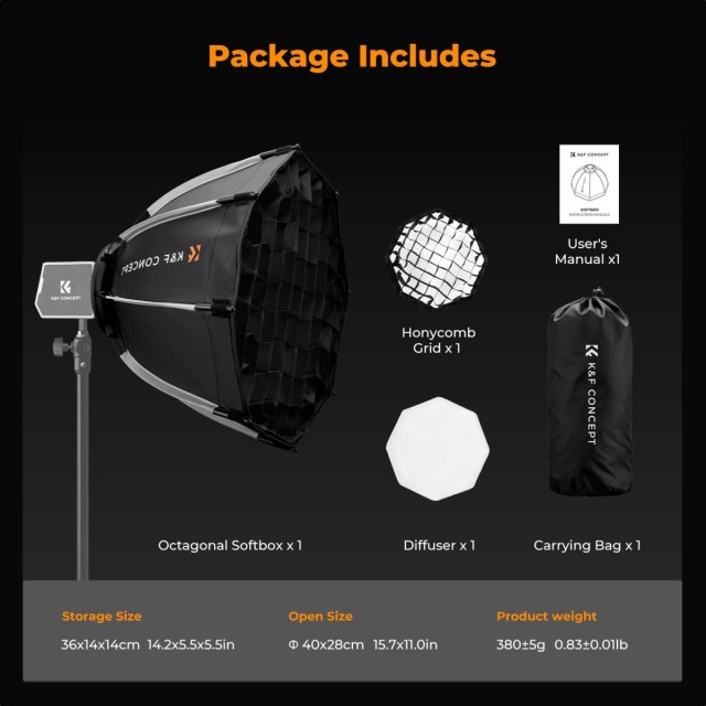 The K&F 40 cm octagonal softbox with mini Bowens mount is the ideal accessory for photographers and videographers who want to achieve excellent lighting results.