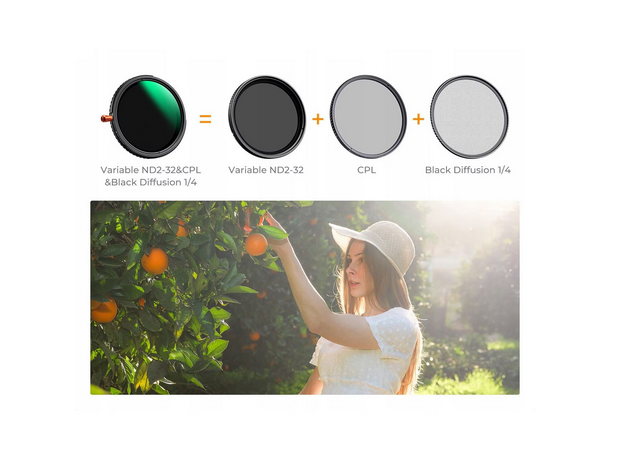 The K&F Concept 55mm NANO C Series 3-in-1 Multi-Function Filter is an advanced hybrid solution that integrates three essential filters into one compact, high-performance tool: a Variable ND2-32 for precise exposure control, a CPL polarizing filter for rich colors and reflection removal, and a Black Diffusion 1/4 filter for soft, cinematic rendering. Ideal for both photography and video, this filter enables long exposures, shallow-depth daytime shooting, improved color saturation, and beautifully diffused portraits—without the need to carry multiple filters.