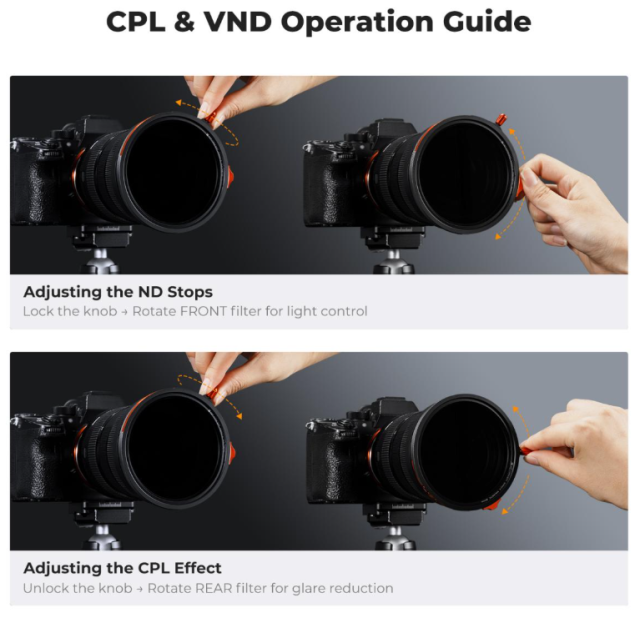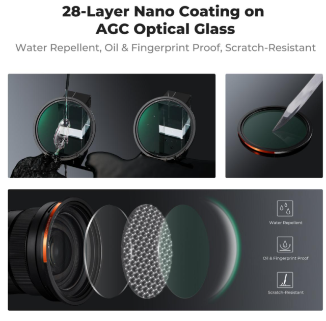 The K&F Concept Nano-X Series 67mm Magnetic Filter Kit streamlines creative filtration for photographers and videographers, offering a magnetic quick-swap system that eliminates threading delays for seamless transitions between effects on compatible 67mm lenses. The kit includes a circular polarizer (CPL) for glare reduction and saturation enhancement (up to 2 stops light loss, 99.8% transmission), a variable neutral density (ND2-32, 1-5 stops) with precise end stops to prevent over-darkening (360° rotation, <1° cross-polarization at extremes), and a Black Mist 1/4 diffusion filter for subtle highlight bloom and skin softening (0.25 density, 95% transmission without color shift). Each filter employs HD optical glass with 28-layer nano-coating (hydrophobic/oleophobic >110°, hardness 9H) for superior durability against scratches, water, and oils, ensuring effortless cleaning with a microfiber cloth. The color-fidelity design maintains neutral tones (no yellowing, <0.1% color cast), while Teflon-infused brass frames enable silent, smooth adjustments—critical for run-and-gun video with on-camera mics. Stacking compatibility requires larger sizes (e.g., 77mm kit stacks 82mm filters), and the included magnetic adapter ring (67mm thread, 2 mm profile) plus 72mm magnetic lens cap provide secure, vignette-free mounting. Packaged in a hook-and-loop pouch (compact 10 x 15 x 5 cm), this lightweight kit (<200 g total) fits in camera bags for on-location use, empowering balanced exposure control, polarization, and atmospheric diffusion in portraits, landscapes, or dynamic footage.
