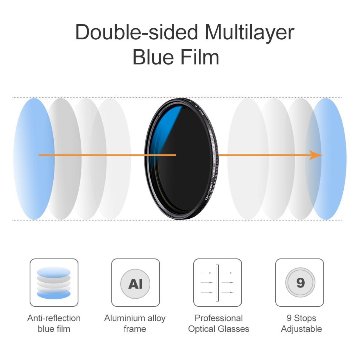 Made from premium optical glass, the filter delivers excellent clarity and minimizes optical distortions. Rotating the front element enables smooth transitions between ND levels, replacing multiple fixed ND filters and providing unmatched flexibility in outdoor shooting. The ultra-thin aluminum frame helps prevent vignetting, even on wide-angle lenses, while its durable construction ensures long-lasting reliability. Ideal for landscape photography, portraiture with shallow depth of field, motion blur effects, bright daylight videography, and slow shutter creative work, this VND filter is an essential tool for achieving consistent exposure and artistic control.
